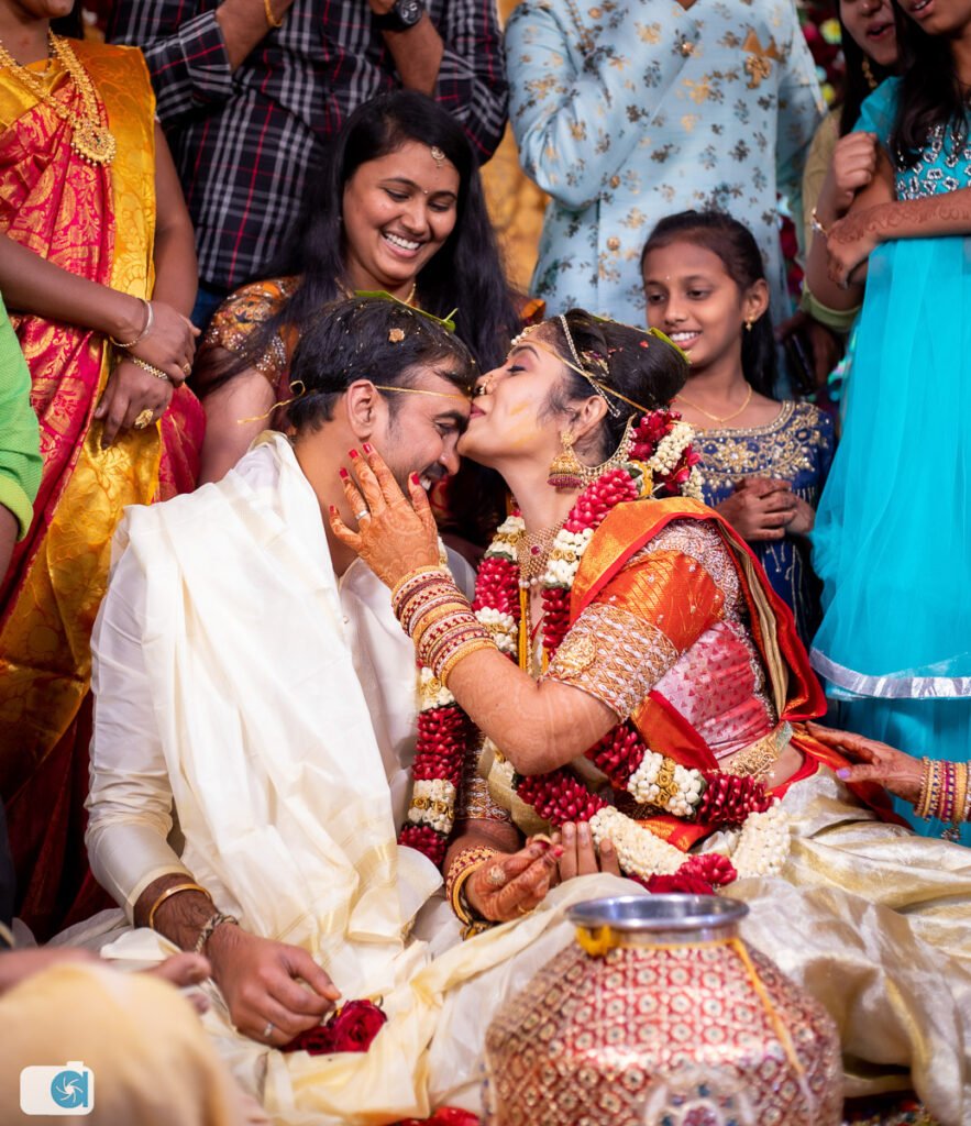 Keerthana & Gautam’s wedding was a vibrant celebration overflowing with love, laughter, and heartfelt traditions. From the very first moment, their joy was contagious, filling the venue with pure happiness. The décor was an enchanting mix of floral elegance and bright, festive colors. Keerthana looked stunning in her traditional bridal attire, glowing with grace and beauty, while Gautam matched her charm, exuding confidence and happiness in his regal ensemble. One of the most cherished moments was the Thalambralu ritual, where rice grains rained down in playful showers, symbolizing blessings and joy. Their smiles during the ritual reflected a bond full of trust and affection as friends and family cheered them on. Music, dance, and heartfelt performances added extra layers of entertainment to the celebrations. The candid shots captured their laughter, tender glances, and joyful spirits perfectly. Every ritual was performed with warmth, blessings, and deep cultural meaning, creating a seamless blend of tradition and lighthearted fun. Under the golden wedding mandap, their chemistry shone brightly. Every detail, from décor to attire, reflected elegance and togetherness. It was truly a day of promises, celebrations, and a love story made eternal.