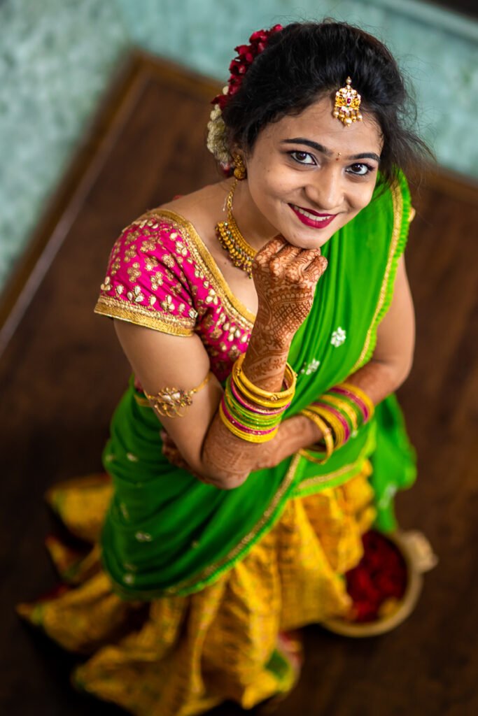 Likhitha & Chanakya’s engagement was a vibrant affair filled with joy, tradition, and love. The ceremony beautifully blended cultural elegance with a touch of modern charm. Every moment radiated happiness, from the bride’s graceful smile to the couple’s playful glances. The décor was a delightful mix of lush green backdrops and bright yellow marigold arrangements. Likhitha looked stunning in a traditional green and pink saree, adorned with intricate gold jewelry. Chanakya complemented her elegance with a royal embroidered waistcoat in rich hues. The exchange of garlands was a heartwarming highlight, symbolizing their union. Candid smiles and soft glances captured the essence of their love story. Family and friends added warmth, making the event even more special. The vibrant floral rings in the background enhanced the beauty of the portraits. Traditional rituals were performed with joy and blessings from elders. Every detail, from attire to décor, reflected cultural richness. The couple’s chemistry shone brightly in every frame. It was a day filled with promises, laughter, and unforgettable memories — a perfect beginning to a lifetime of love and togetherness.